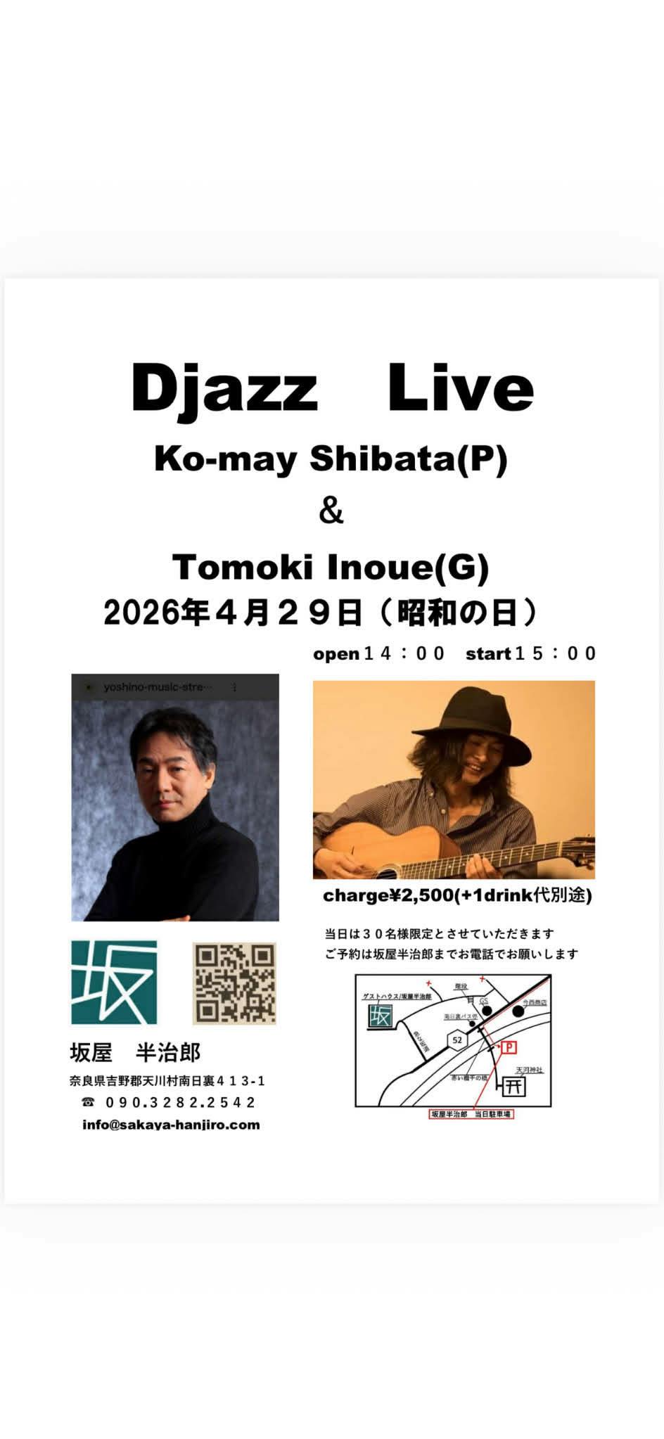 2026/4/29天川村「坂屋半治郞」 Djazz Live 2026年4月29日(昭和の日)open14:00 start15:00 坂屋半治郎(奈良県吉野郡天川村南日裏413−1) 井上知樹(g) 柴田コウメイ(p)