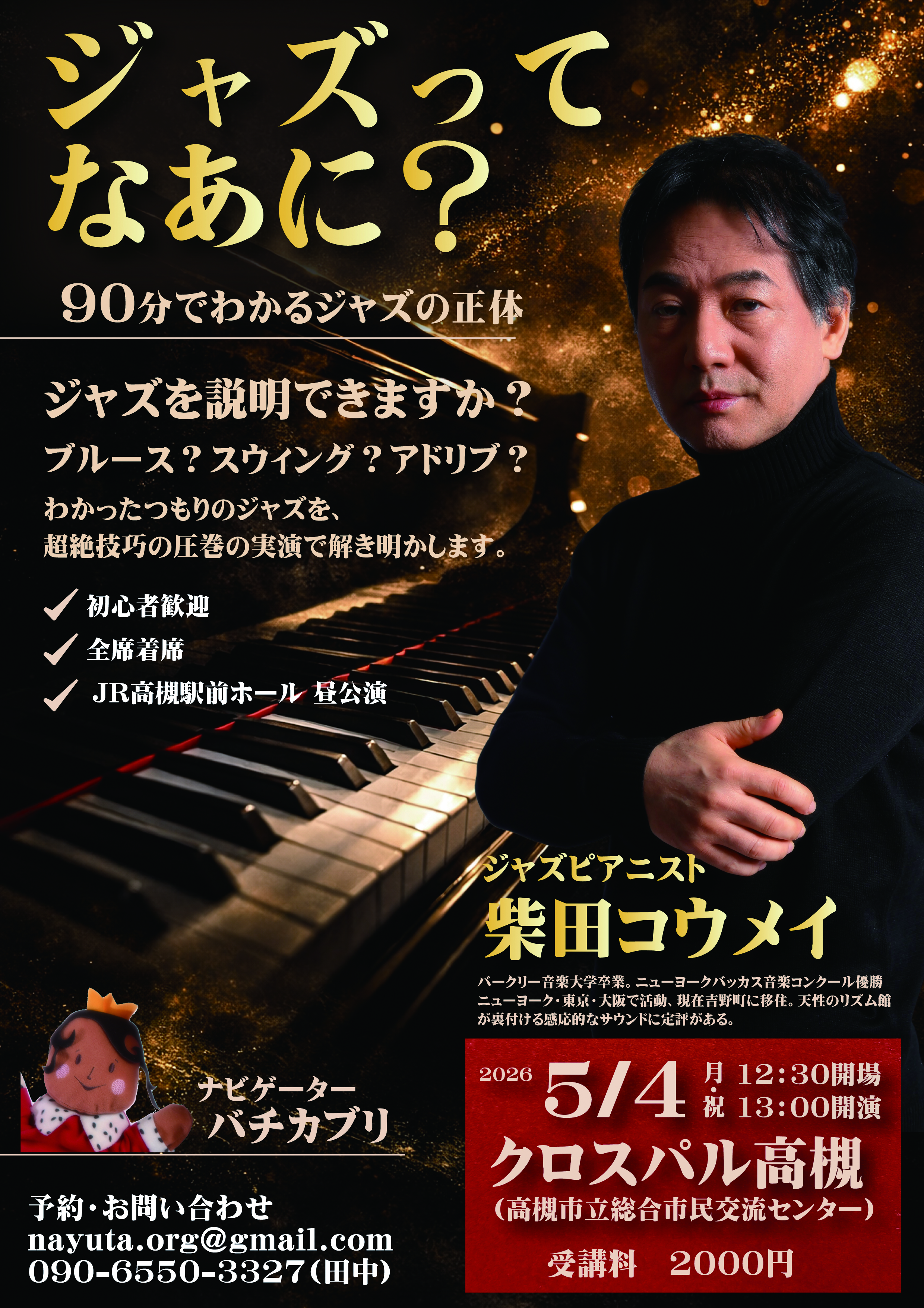 2026/5/4高槻市駅前クロスパル高槻「ジャズってなあに?劇場版」 ジャズってなあに?劇場版 2026年5月4日(月・祝日)open12:30 start13:00 クロスパル高槻(奈良県吉野郡天川村南日裏413−1) 柴田コウメイ(p) バチカブリ(ナビゲーター)